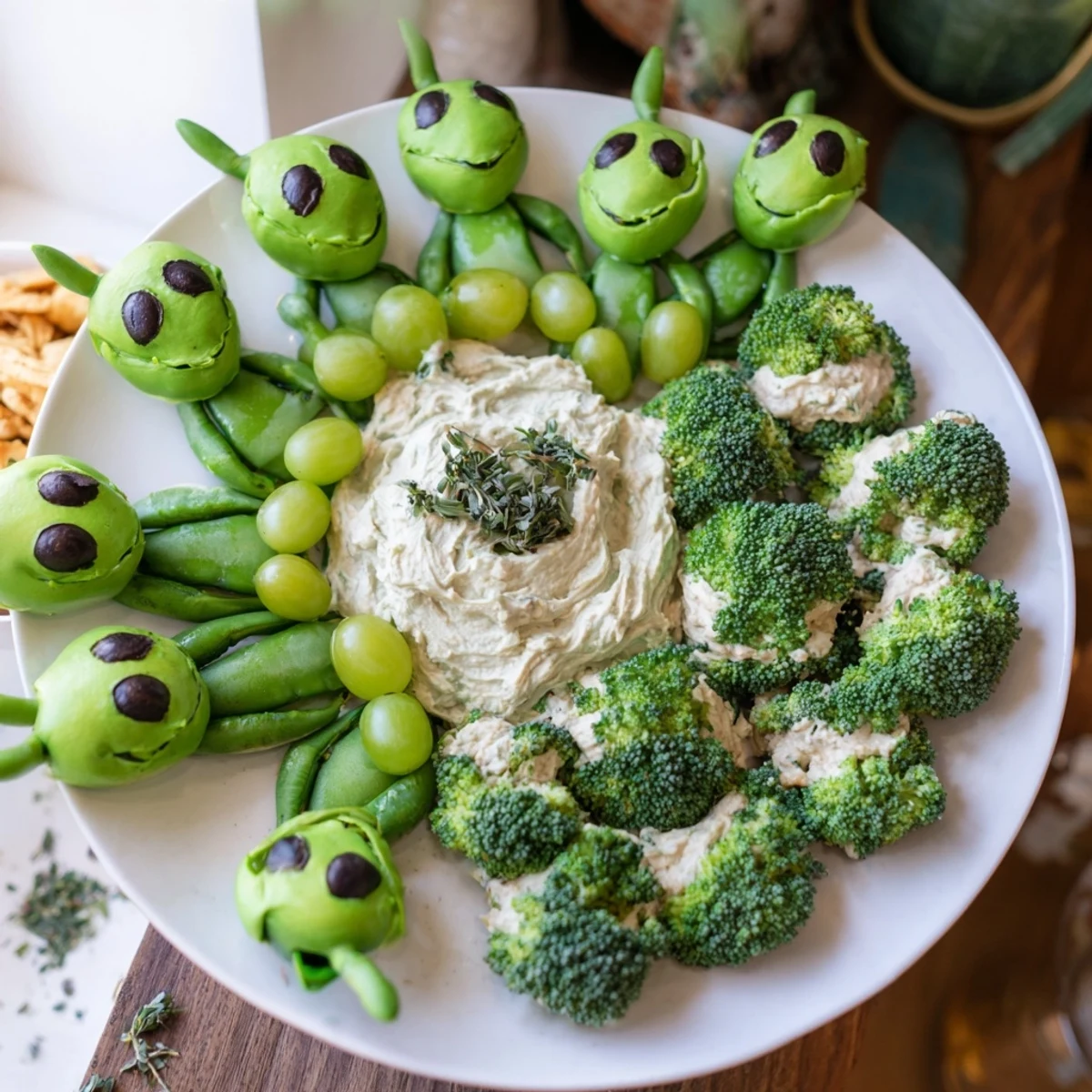 Save The combination of sugar snap peas, broccoli florets, and green grapes creates a whimsical alien body perfect for decorating with dollops of guacamole and herbed cream cheese. Black olive slices add a touch of character as eyes and facial features, making each snack uniquely delightful. Surrounded by crunchy green tortilla or vegetable chips, these treats deliver both texture and flavor.