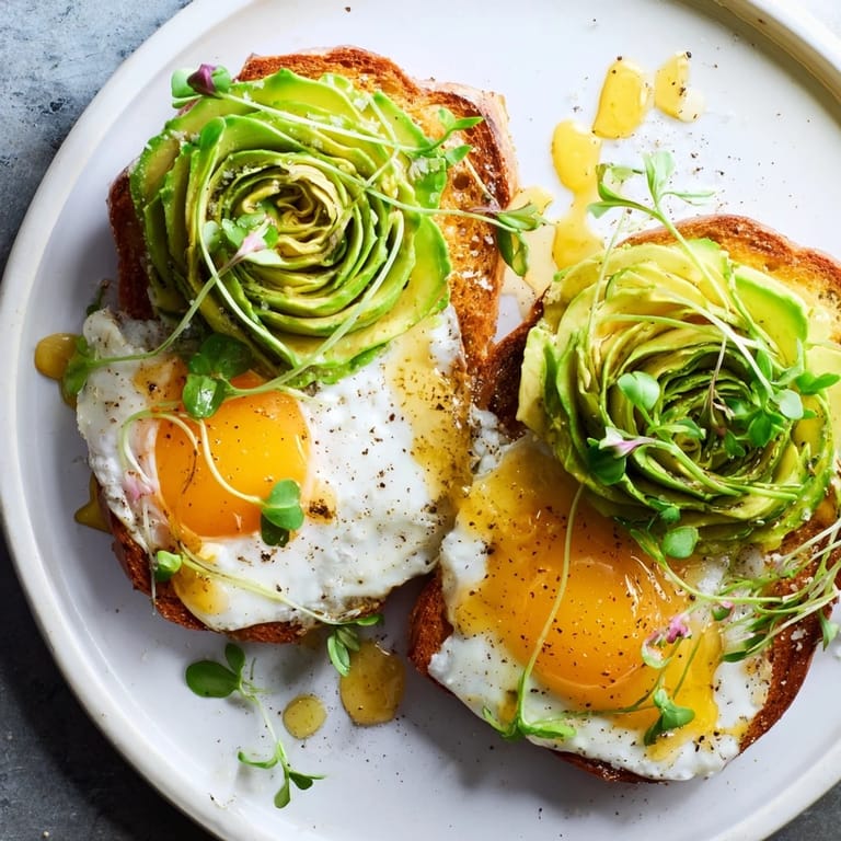 - Place each cloud on a slice of toast, crown it with your avocado rose, drizzle with honey, and scatter microgreens on top.