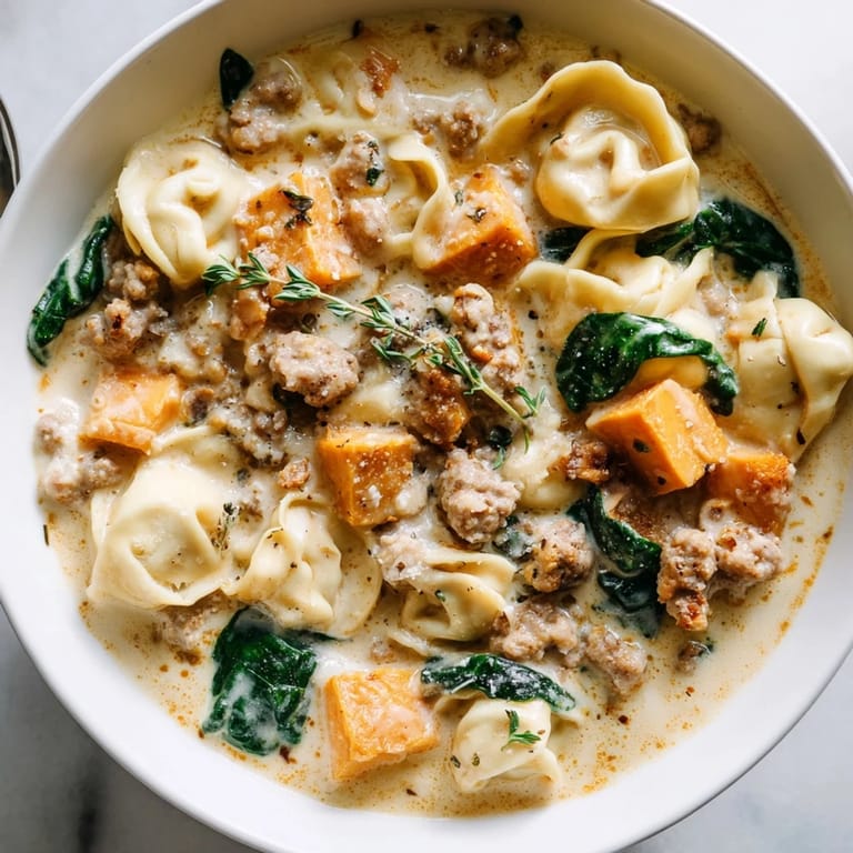 Enjoy this creamy sausage tortellini soup as a hearty meal perfect for cold days.