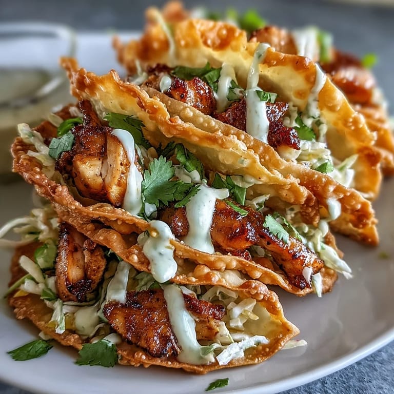 Save My neighbor showed up one afternoon with a bag of wonton wrappers and a wild idea: what if tacos didn't need tortillas? I was skeptical until I watched her drop those thin squares into hot oil and pull out golden, shatteringly crisp shells that folded like tiny edible wings. We filled them with whatever was in my fridge, marinated chicken thighs I'd forgotten about, shredded cabbage, a squeeze bottle of sriracha mayo, and suddenly dinner felt like an accident worth repeating. That crunch, that contrast of smoky spiced meat against cool slaw, turned into something I now make whenever I want to surprise myself.