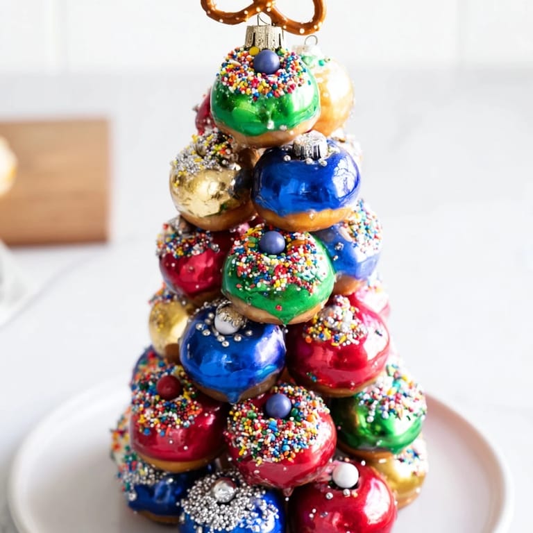 Save A whimsical and festive dessert centerpiece featuring stacked mini donuts decorated to resemble colorful Christmas ornaments Perfect for holiday gatherings this edible tower combines sweet flavors with eye-catching holiday cheer
