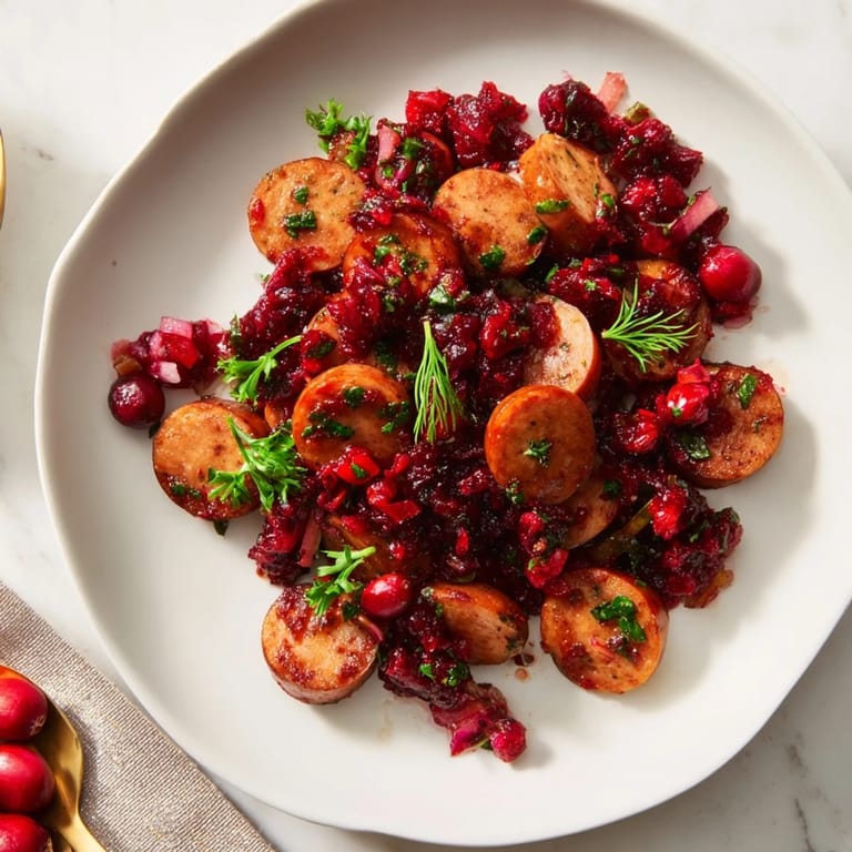Save Savory sausage rounds topped with tangy cranberry sauce and fresh herbs, these festive bites are perfect for holiday gatherings and cocktail parties.