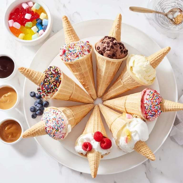 Save A playful and vibrant dessert platter featuring an array of ice cream cones, toppings, and accompaniments—perfect for parties or family gatherings.