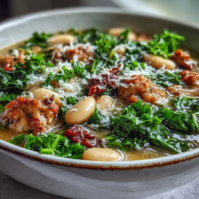 Save There's something about a pot of Italian white bean soup that makes a kitchen feel instantly warm, even on the coldest afternoons. I discovered this particular version while rummaging through a half-empty pantry on a Tuesday evening, finding a can of beans, some wilting kale, and a package of sausage that needed using. What started as improvisation became something I now make deliberately, craving the way the spicy sausage perfumes the broth and those creamy beans soften into almost-silk.