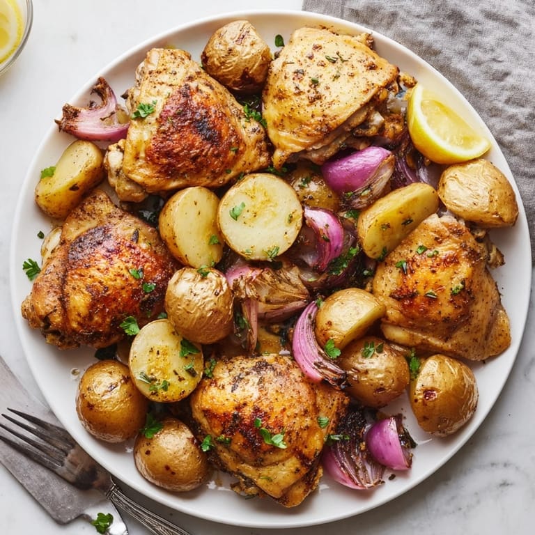 Save A vibrant comforting dish featuring juicy chicken and tender potatoes roasted together with zesty lemon and fresh herbs all in a single pan for easy cleanup.