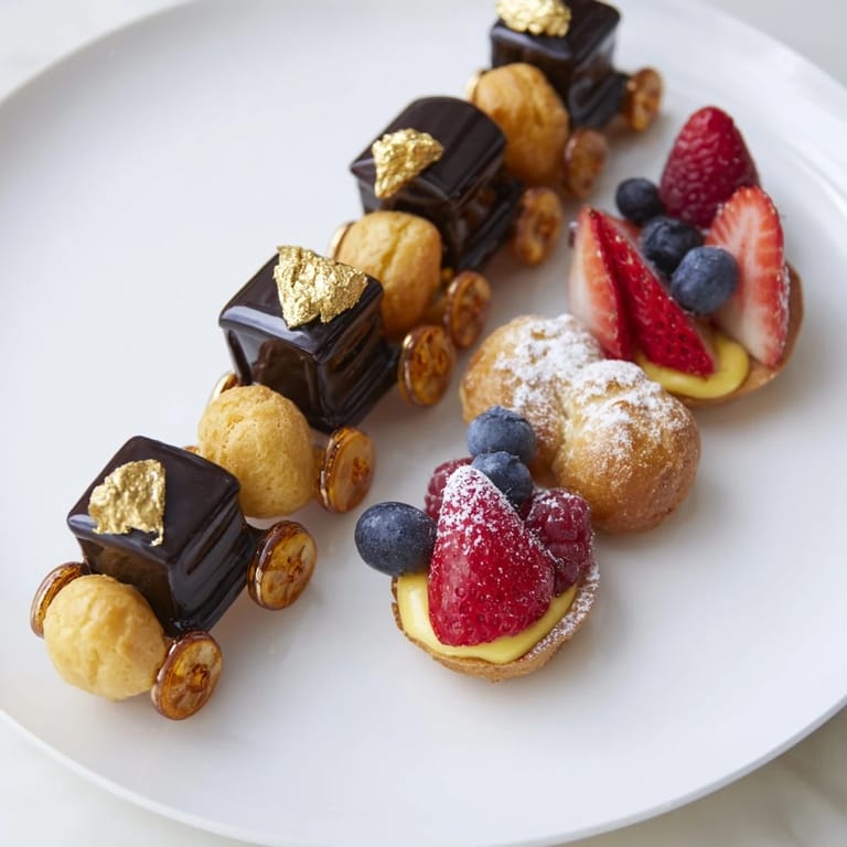 Experiment with different fillings for the choux puffs such as coffee or vanilla cream to personalize your mignardises. Seasonal fruits can be swapped in the tartlets to keep the recipe fresh year-round. For an extra whimsical touch, consider adding chocolate rails or cookie tracks to enhance the train theme visually.